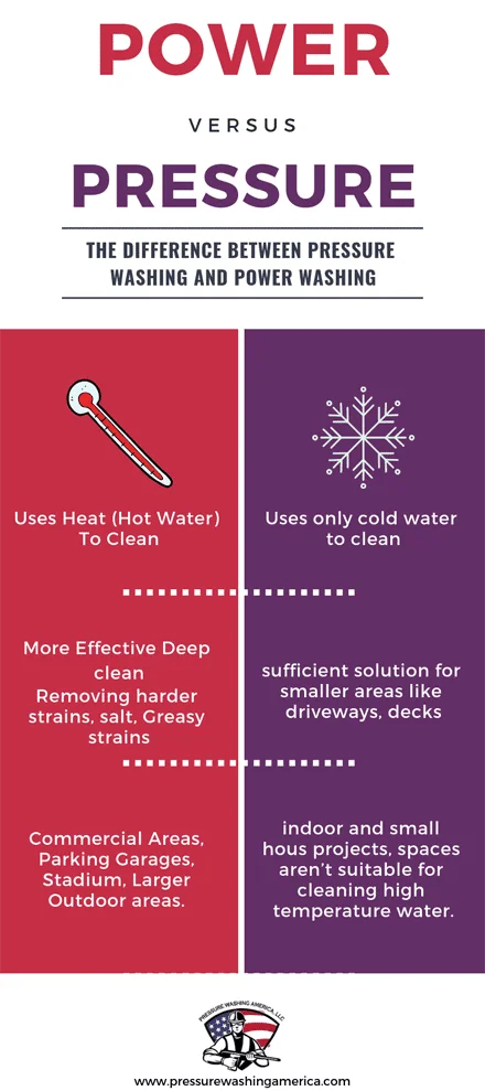 These two use pressure and water, only power washing uses heat to clean. Pressure washers usually use cold or tepid water. Cold water pressure washers rely on the mechanical force of a pressurized water jet to dislodge dirt from the surface that needs to be cleaned.